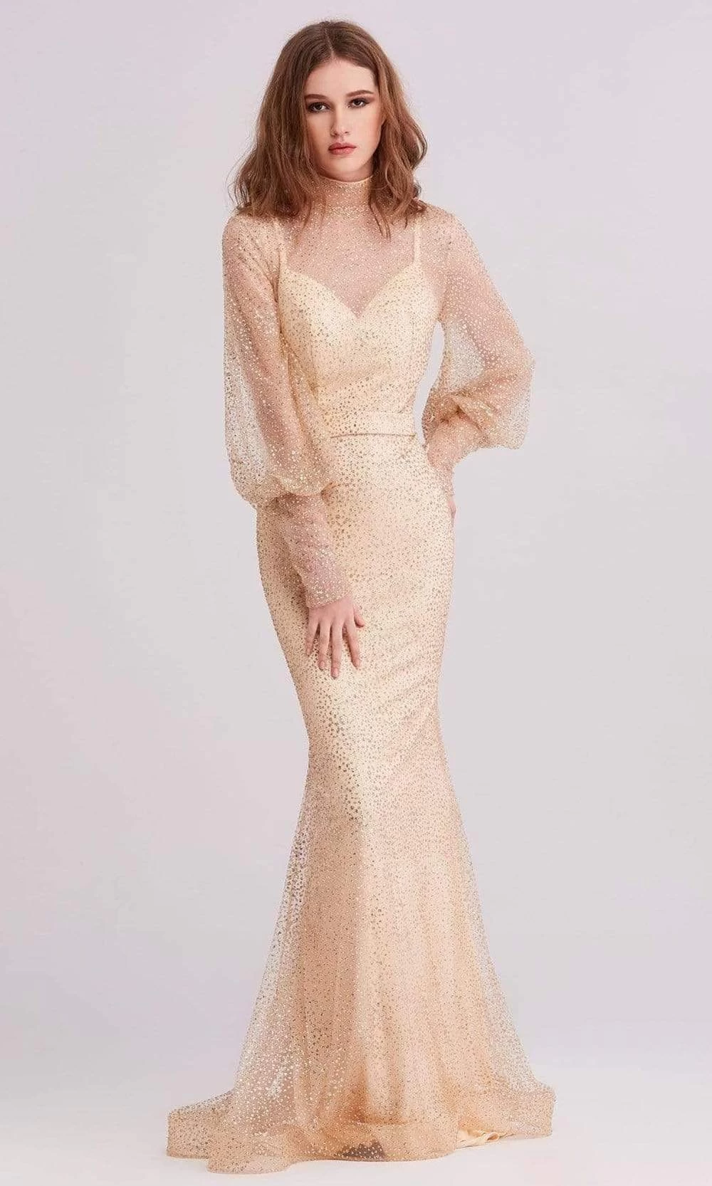 Enter the hall with grace and beauty in Jadore J15027. Designed with glitters all throughout, a promise of shine and shimmer is real. It has a see-through effect and features high neckline and bishop long sleeves, perfect for modest girls. It uses waist band around natural waist and parades a fit and flare trumpet silhouette in full length. This Jadore will definitely bring out the goddess in you!