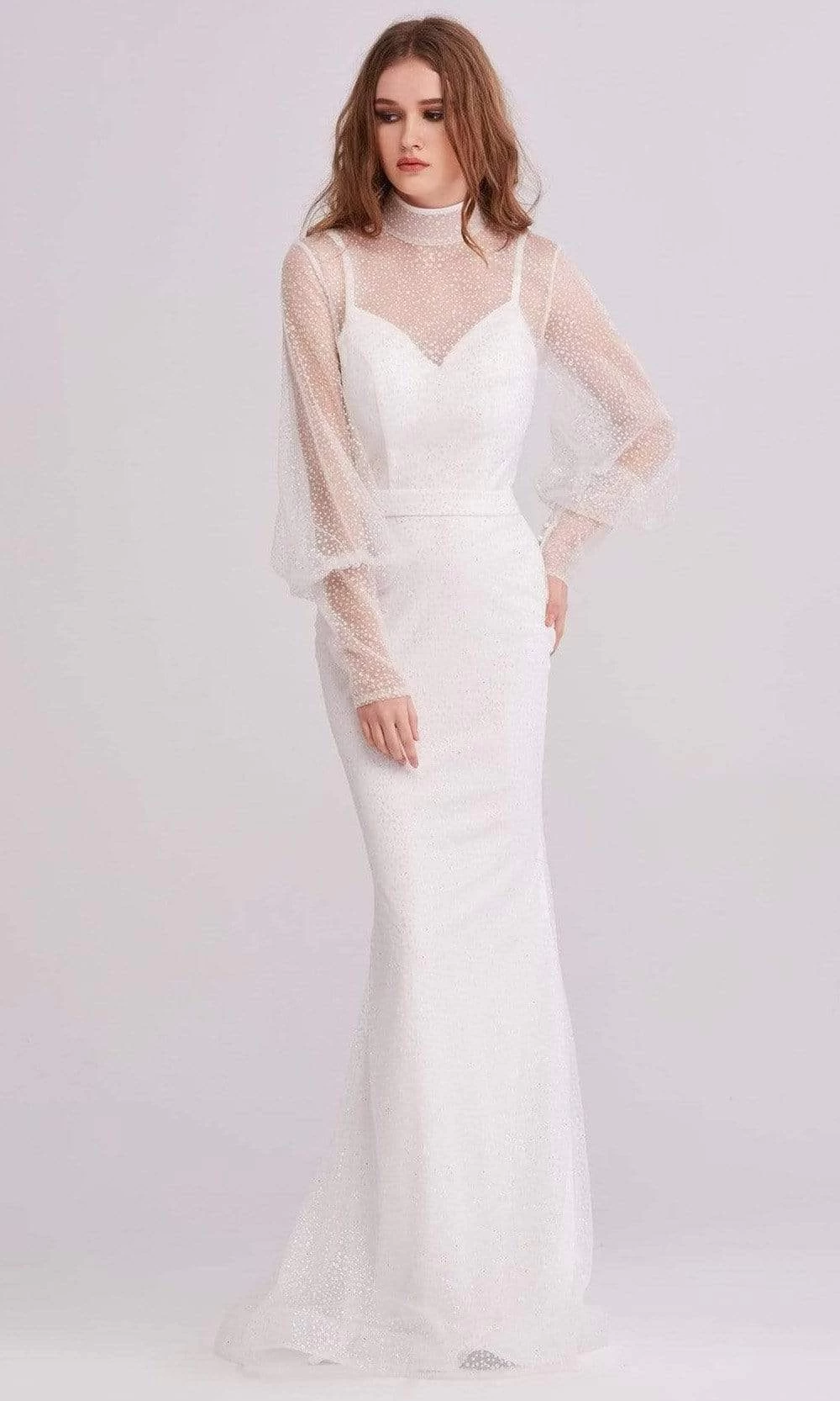 | Details: | Long sleeves, Bishop sleeves, Glitters, Waist band, Fitted bodice, Sheer, See-through, Back zipper, Floor length, Sweep train |