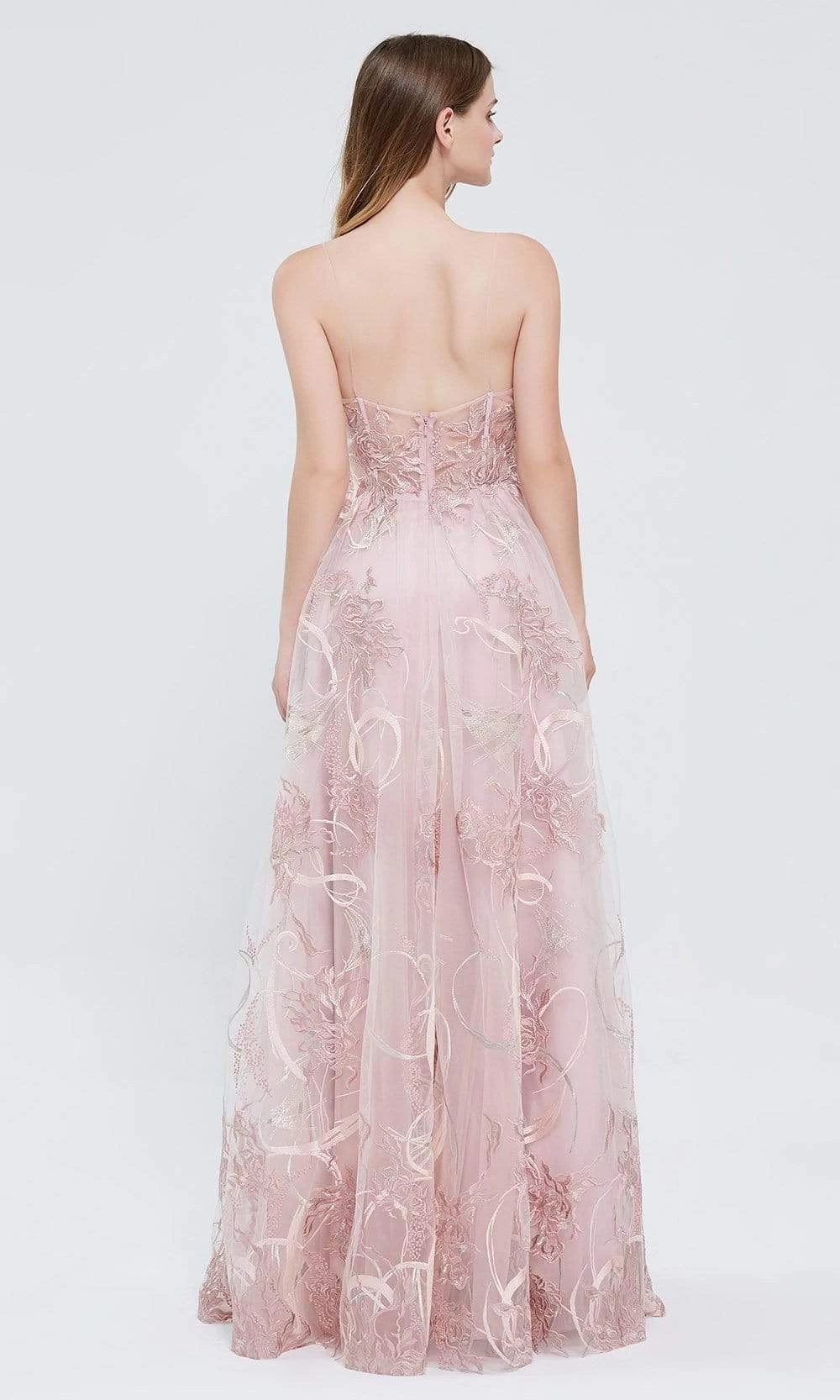 | Details: | Sleeveless, Spaghetti straps, Plunging sweetheart neckline, Sheer bodice, Corset, Embroidery, Mid back, Back zipper, Floor length, Sweep train |