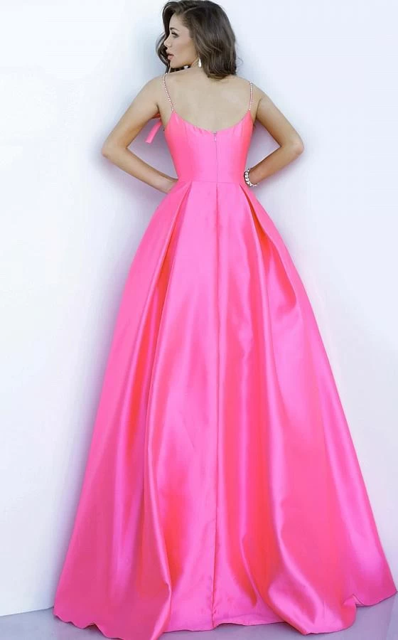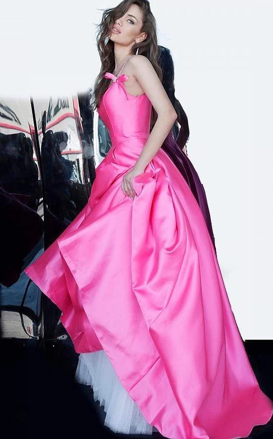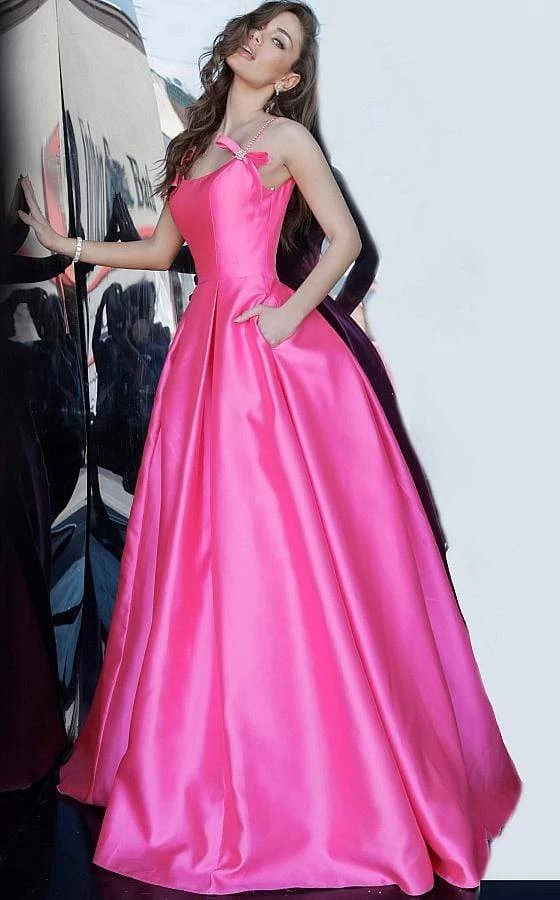 Be ready to fascinate everyone in this design by Jovani 00199. This mikado gown is tailored in a sleeveless, scoop neckline with embellished straps and bow details. The fitted bodice has a back zipper closure while the pleated skirt flourishes a ballgown silhouette. Be fabulous in this Jovani gown.รย