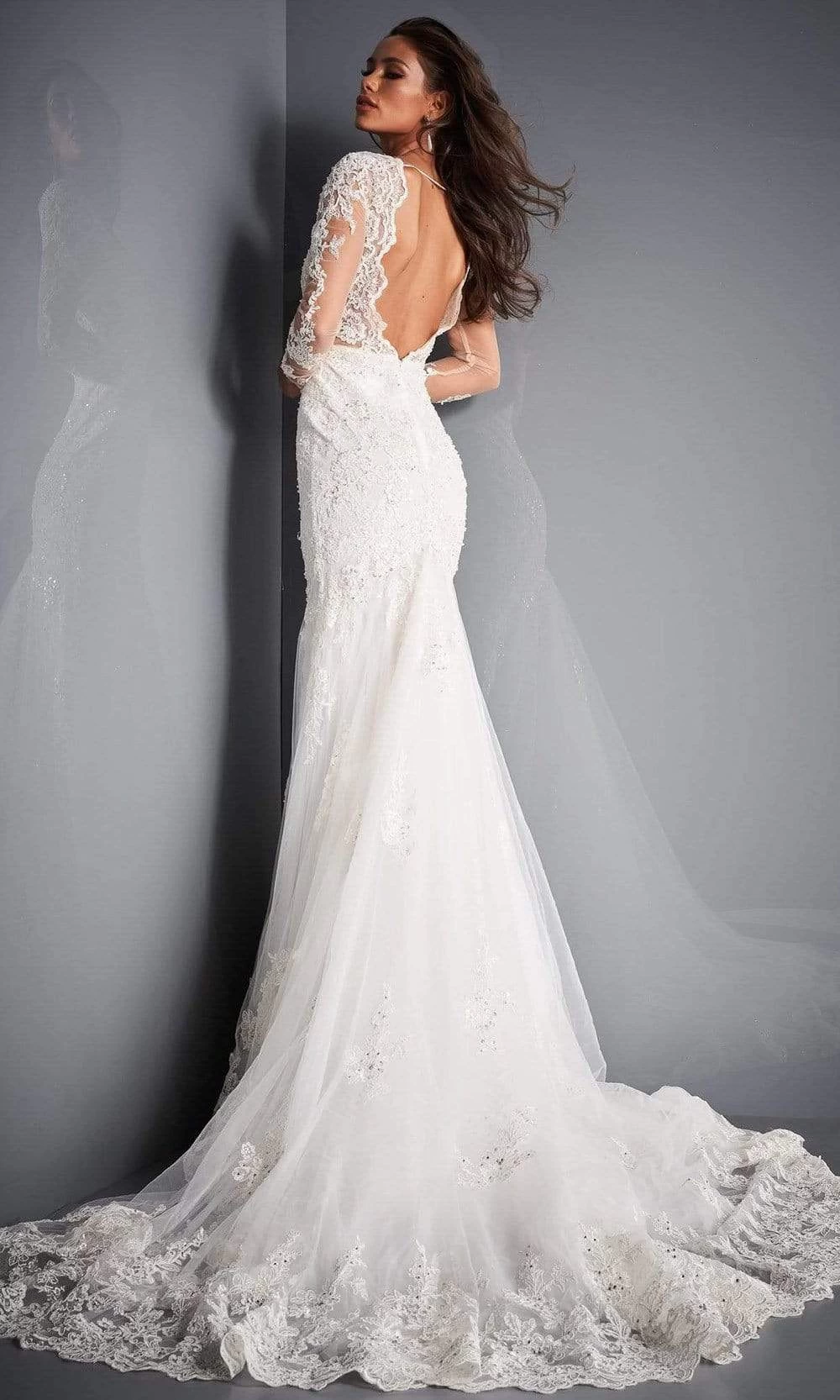 Step through the chapel door in the perfection of a romantically embellished wedding gown by Jovani JB02579. A plunging V neckline with sheer inset detail and sheer long sleeves frame the fitted bodice, complemented with a scalloped open V back. Heat stone scattered stunningly in this dress as the skirt graces a trumpet silhouette which finishes with a chapel train. Fascinate them all with this Jovani dress.
