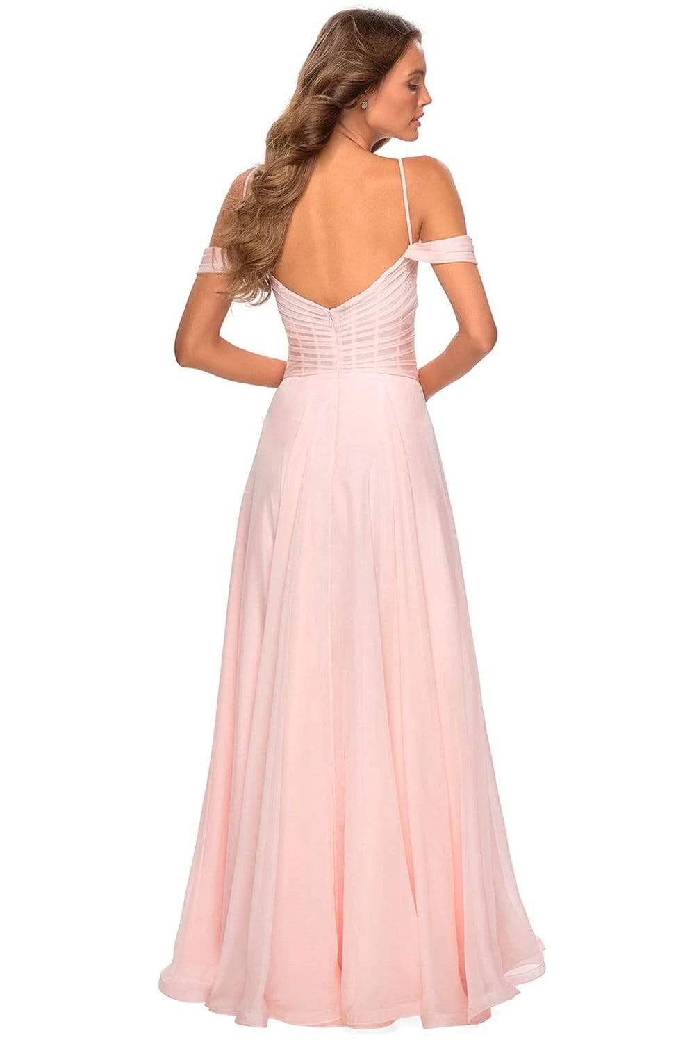 Flourish with elegance and ethereal flair in this La Femme 28942 creation. Crafted with intricate tucks that crosses along the bodice, this gown features a deep v-neckline hanging from spaghetti straps. Draped with arm bands that showcase cold shoulder details, the back is accented with a v-open style. The chiffon skirt opens with a side slit as it flares into an A-line silhouette. Look gorgeous for that spectacular event in this La Femme masterpiece.