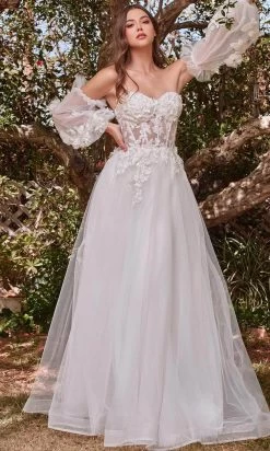 This Ladivine CD962W creation adds a subtle touch of shine to the fairytale-inspired wedding dress. Lace and three-dimensional floral designs adorn the sheer corset-style bodice. Beautiful details include the sweetheart neckline, translucent bishop sleeves, and an open back design. The skirt of the ballgown has a lovely horsehair hemline and tulle overlay that cascades to the ground. Take your seat on the throne in a queenly gown from Ladivine CD962W.The model is wearing Off White. Find more Floral Dresses.