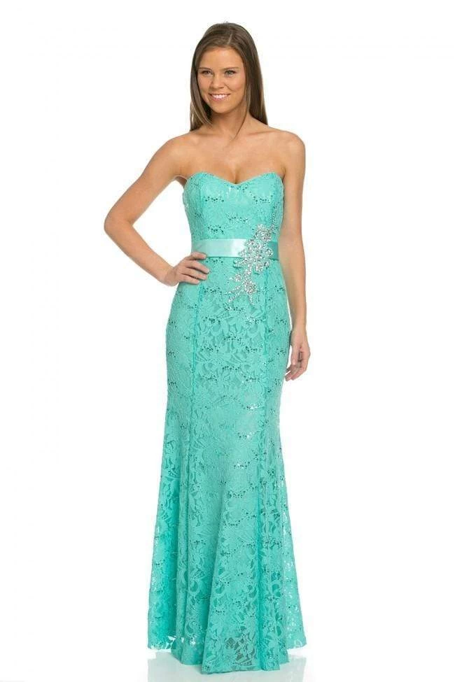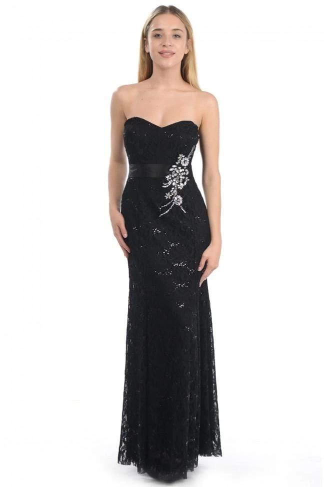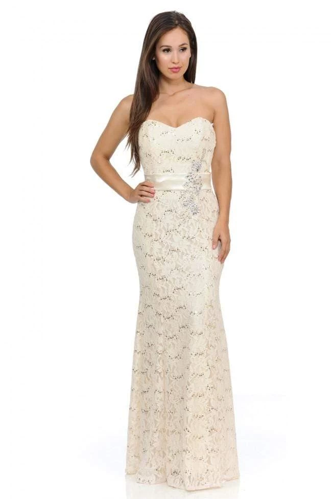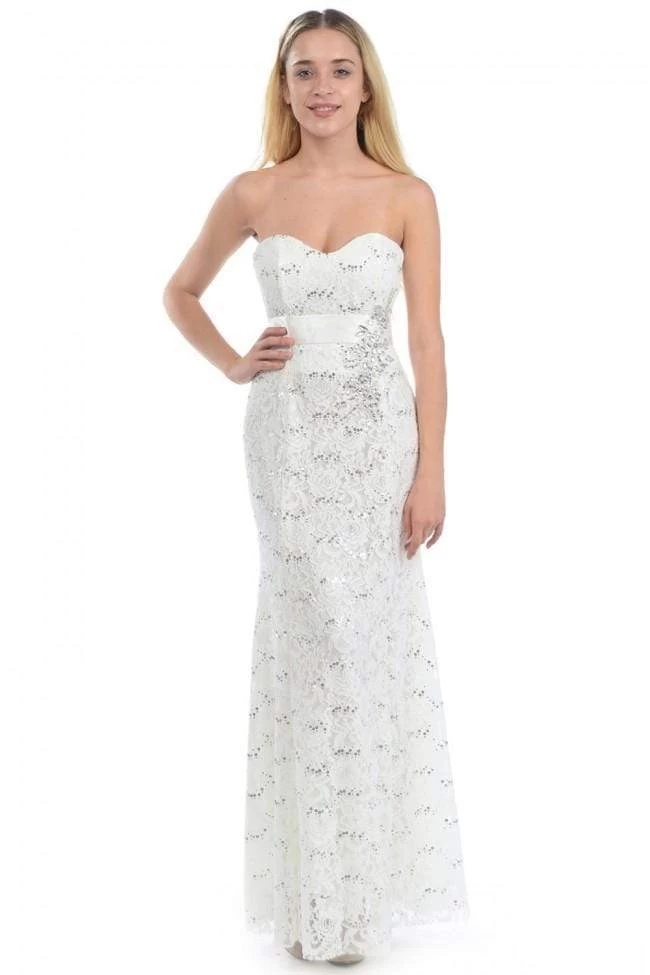 | Details: | Satin, Sequined lace, Beaded accent, Strapless, Fully lined, Back zipper closure |
