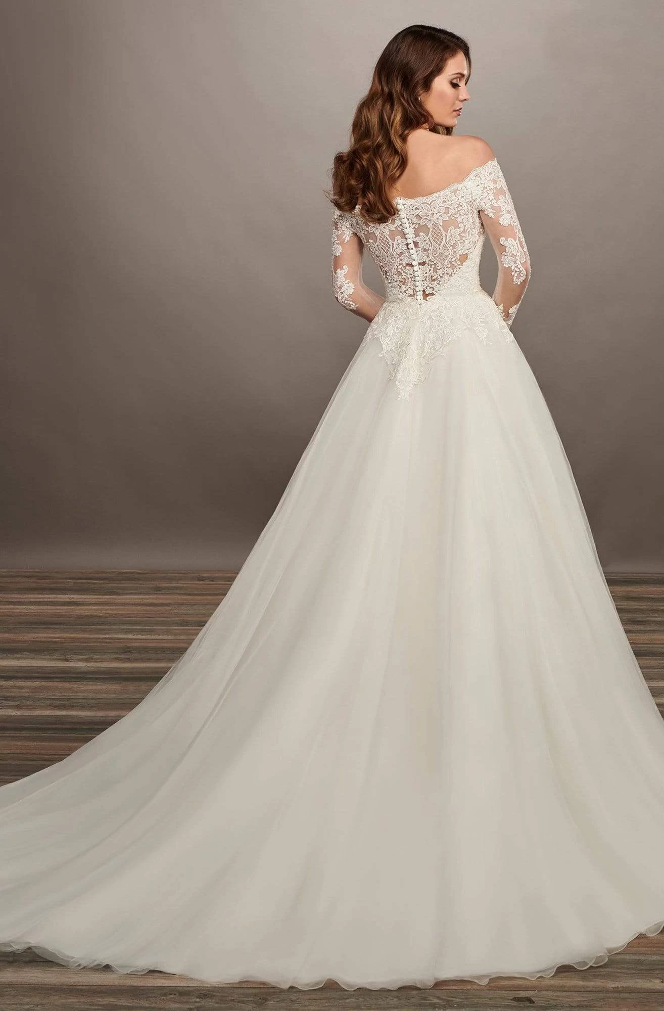Make his heart skip a beat when you walk down the aisle in this Mary’s Bridal MB2070 creation. Exceptionally textured with intricate lace, this gown flatters with a scalloped illusion off shoulder neckline. Depicting the sheer elegance of the bodice, the illusion back parades a lace design as covered button trails its length. Sheer long sleeves are glamored up with lace details. A plunging sweetheart lining sculpts down to the sumptuously layered skirt and a chapel trail. Go for the traditional yet romantic look in this Maryโs Bridal masterpiece. Model is wearing the Ivory color.