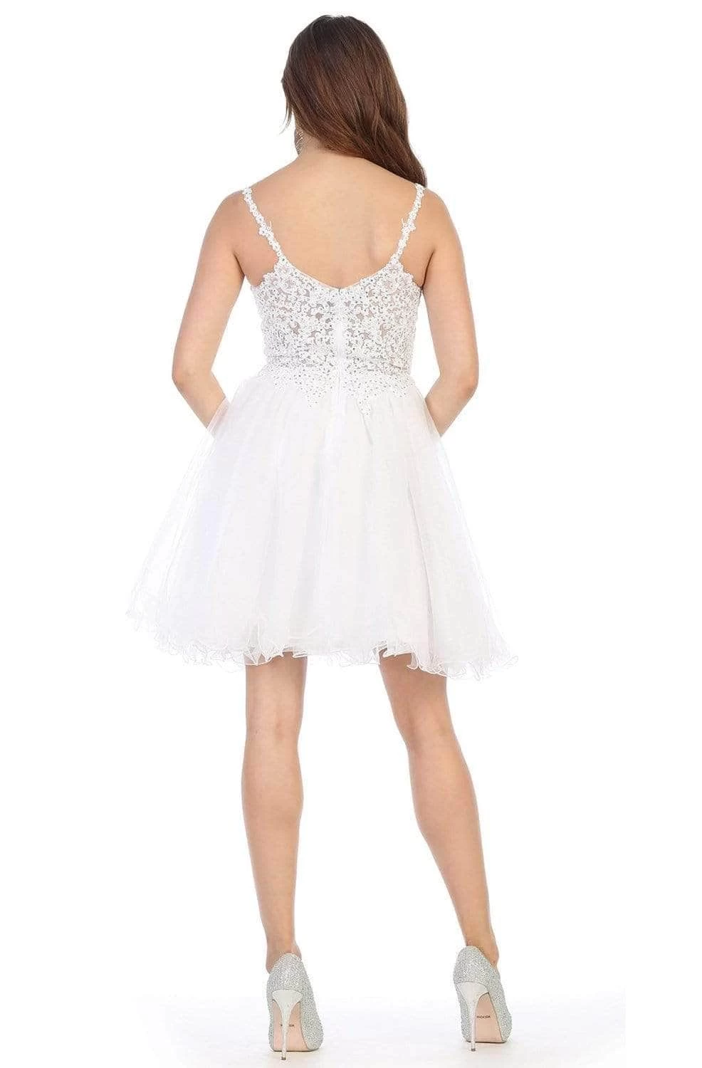 Radiate refined glamour while flaunting your ethereal beauty in this opulent dress from May Queen MQ1693. This dress flaunts a charming v-neckline with embellished shoulder straps, and features lavishly beaded lace appliques throughout the semi-sheer bodice. The back has zip closure while the tulle skirt romantically flares in A-line silhouette with playful rolled hemline at mid-thigh. Make a dazzling sight to behold at every party in this May Queen MQ1693 dress for cocktail, prom, homecoming and parties. Models are wearing the Baby Blue, Navy and White colors.