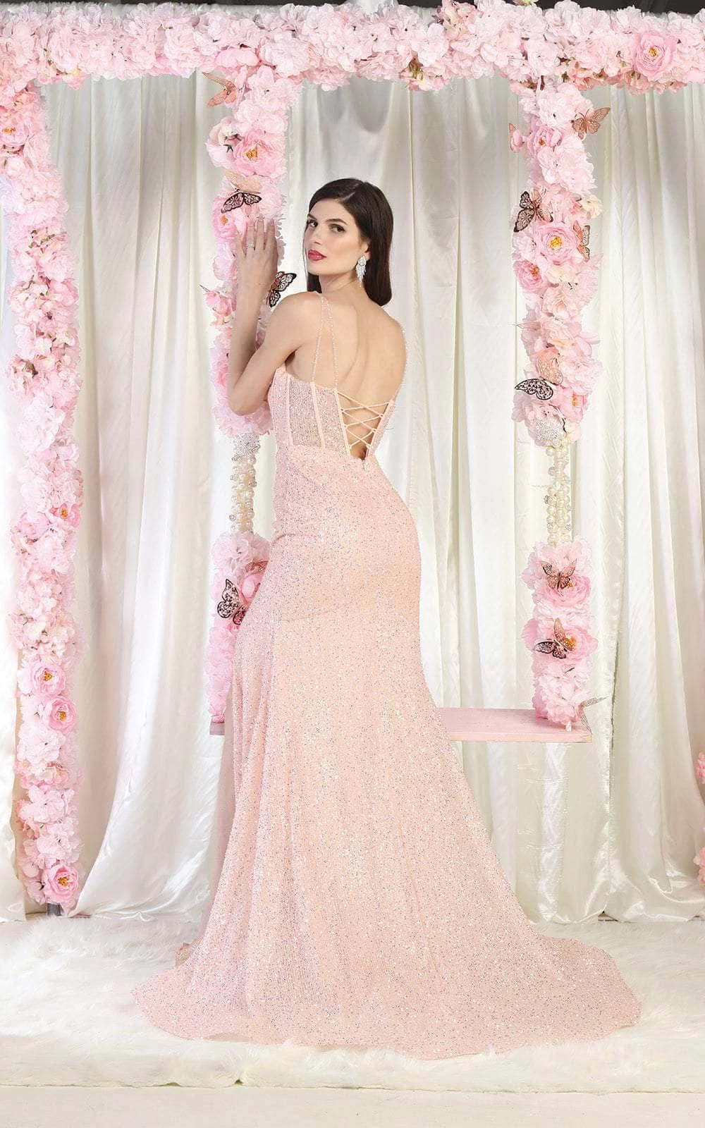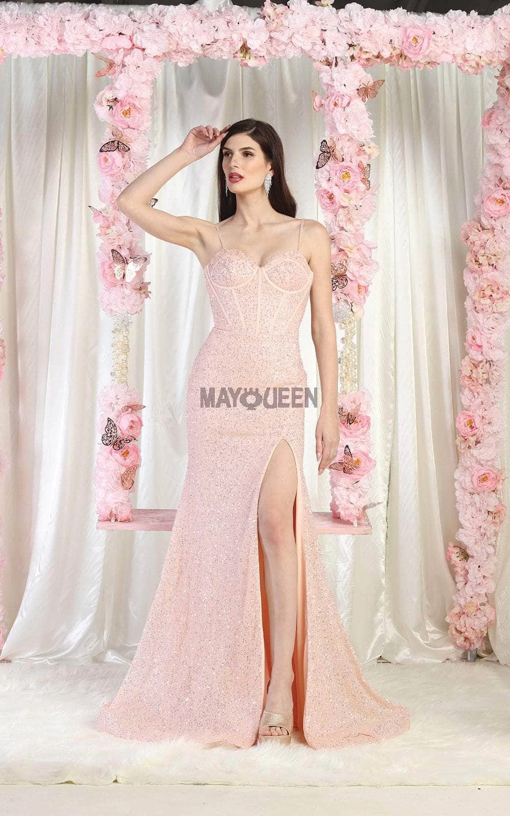 May Queen RQ7981 dress is the epitome of feminine flair. Adorned with intricate sequin embellishments, this dress features a flattering sleeveless design and a corset bodice that accentuates your curves. The multiple straps create a striking visual effect, while the lace-up back ensures a perfect fit. The full-length skirt flows gracefully, ending in a daring slit that adds a touch of sensuality. The train brings an element of grandeur, making this dress perfect for any special occasion. Completed with a back zipper closure, May Queen RQ7981 is the embodiment of elegance and sophistication. Models are wearing Black, Blush, Dusty Blue, and Mauve colors.