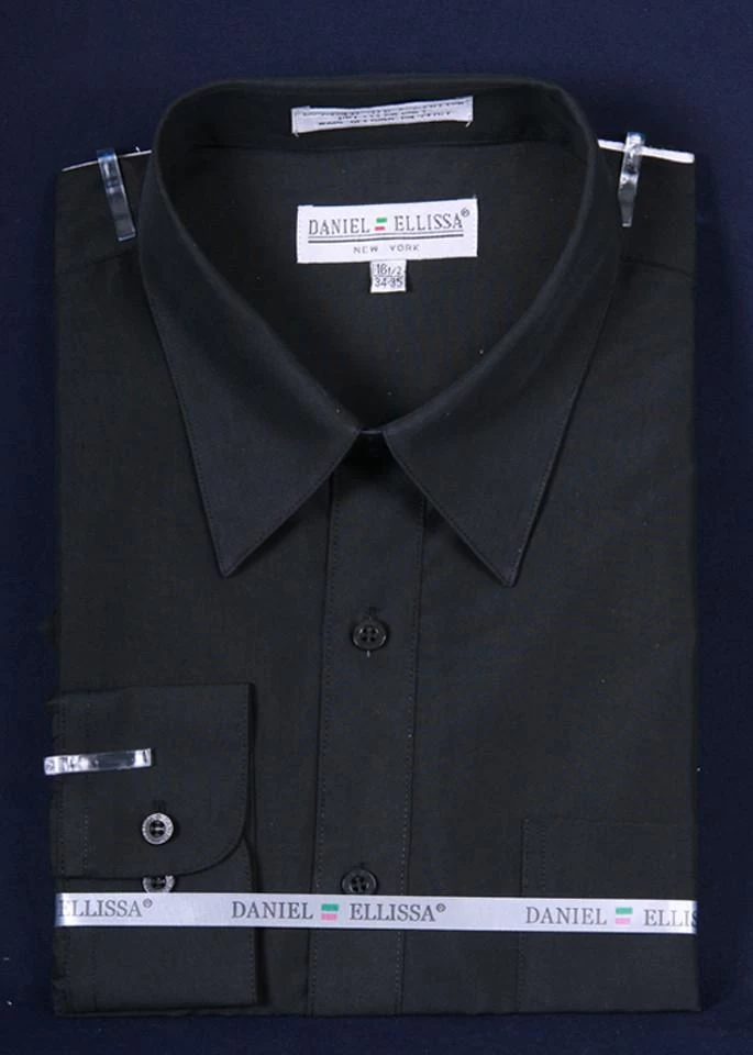 This versatile and dapper long-sleeved black dress shirt is a must-have for your closet. Made out of 65% cotton and 35% polyester, this solid black shirt features a spread collar and a button-front placket. Look sharp in this dress shirt at work, weddings, church, or for any occasion. We love this solid dress shirt because it comes in sizes, which is perfect for weddings, stage productions, and church events.
