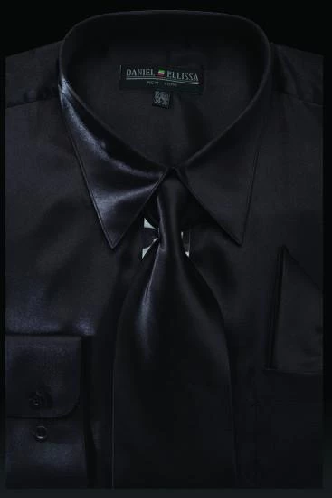 Classy and sleek, this men’s black satin dress shirt will complete your formal look to perfection. Designed by Daniel Ellissa, this shiny satin dress shirt is made out of 100% polyester, and features a spread collar, chest pocket, and button-front placket. Our customers love this shirt because it includes a matching necktie and handkerchief. This shirt is available in sizes, making it perfect for large group events such as: weddings, stage productions, and church events.