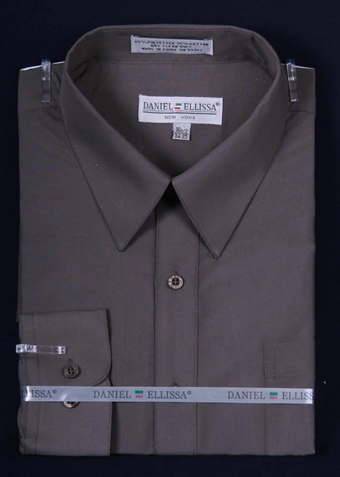 Express your dapper side in this long-sleeved charcoal dress shirt. Made out of 65% cotton and 35% polyester, this solid charcoal shirt features a spread collar and a button-front placket. Look sharp in this dress shirt at work, weddings, church, or for any occasion. We love this solid dress shirt because it comes in sizes, which is perfect for weddings, stage productions, and church events.