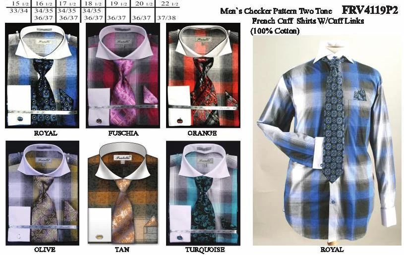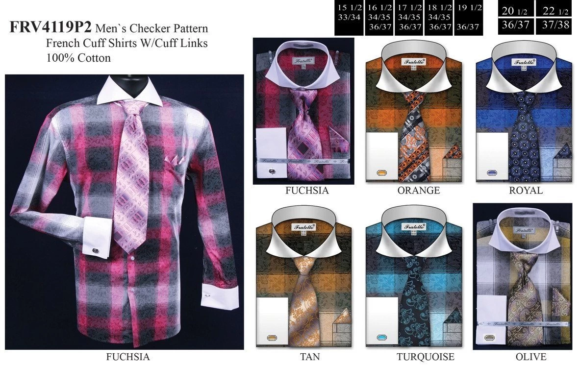 - Men’s Large Plaid Pattern Dress Shirts with Tie, Hanky, Cufflinks
