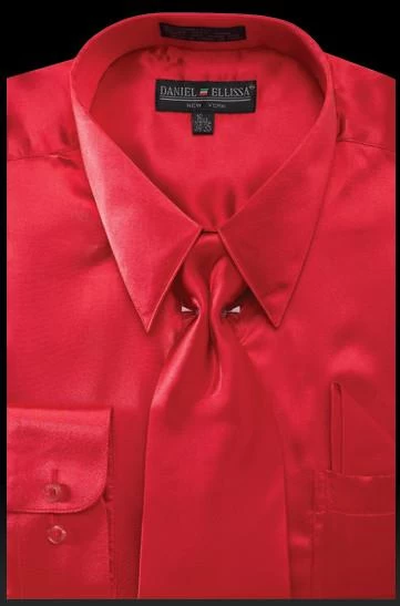 Look dapper in this men’s red satin dress shirt at your upcoming formal event. Designed by Daniel Ellissa, this shiny satin dress shirt is made out of 100% polyester, and features a spread collar, chest pocket, and button-front placket. Our customers love this shirt because it includes a matching necktie and handkerchief. This shirt is available in sizes, making it perfect for large group events such as: weddings, stage productions, and church events.