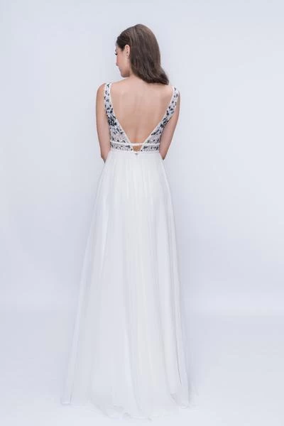 | Details: | Sleeveless, Sheer Inset Panel, Floral Embroidered Bodice, Beaded Belt, Pleated Skirt, Full Length, V Back, Back Zipper Closure |