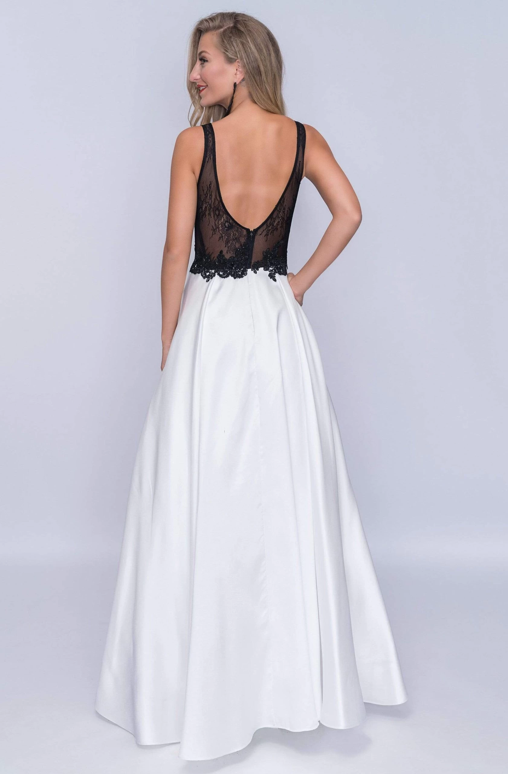 | Details: | Sleeveless, Lace bodice, Sheer fabric, Side pockets, A-line skirt, Low V-back, Back zipper |