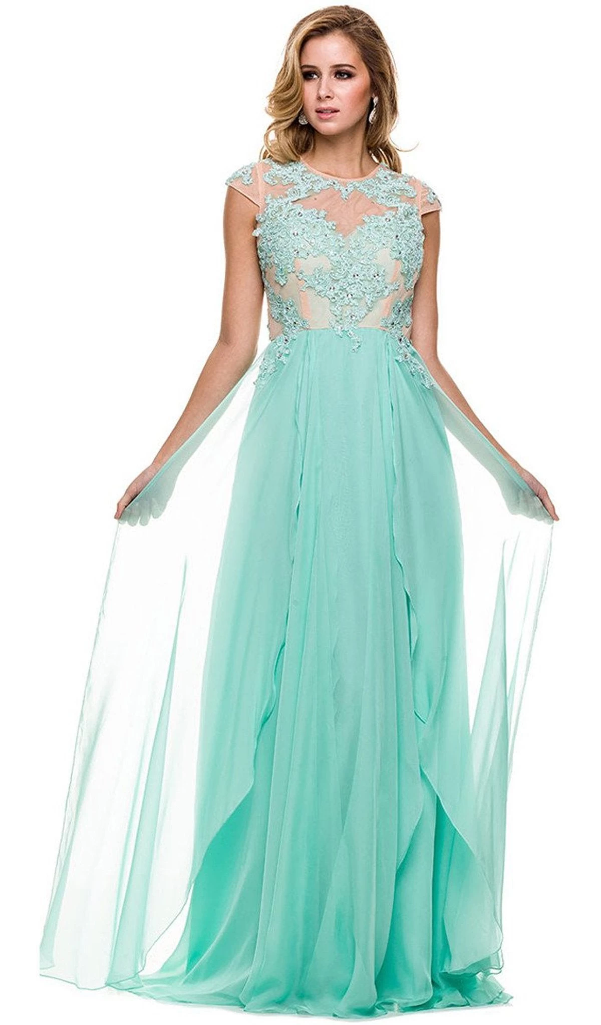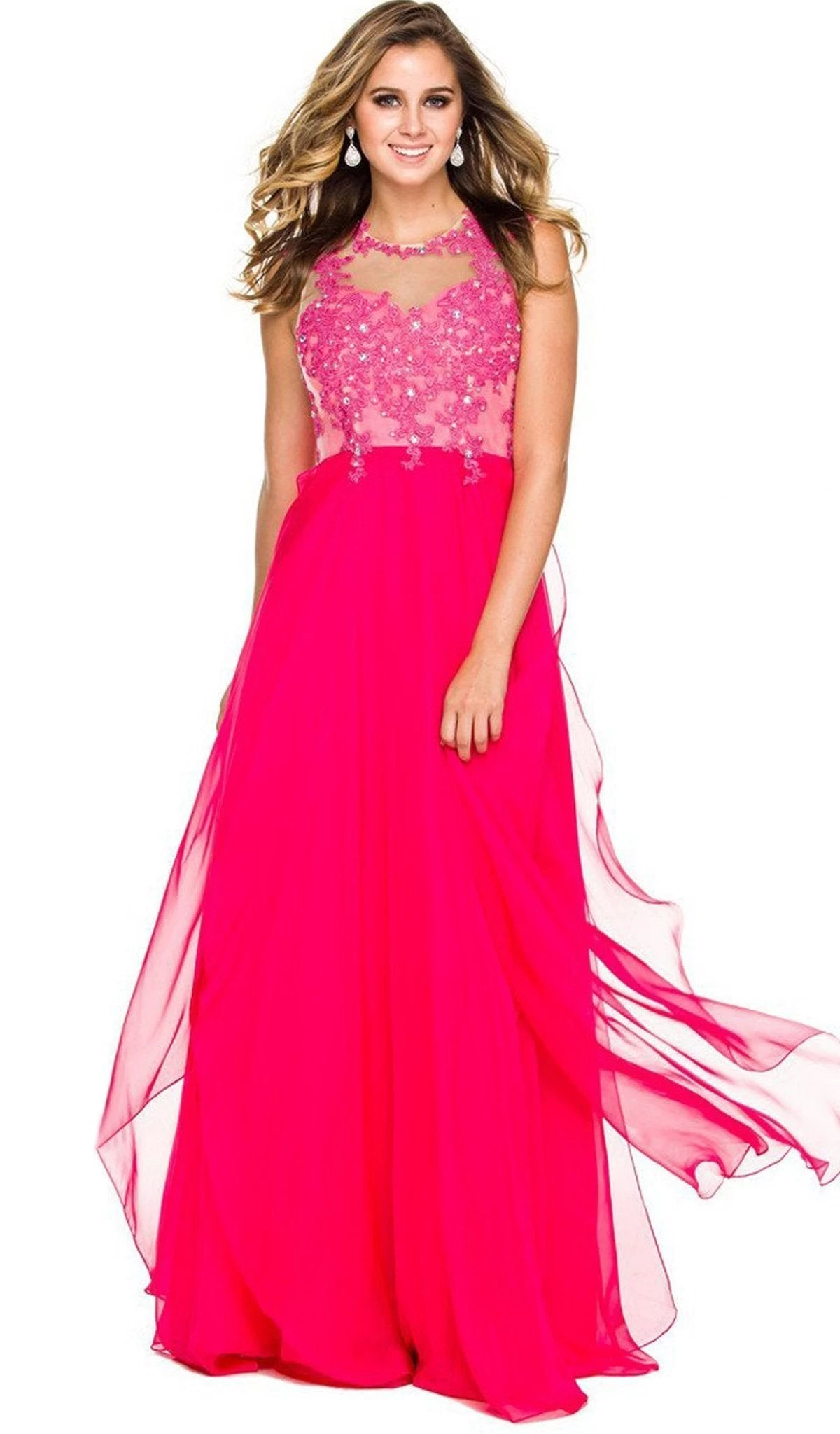 | Details: | Chiffon material, A-line skirt, Sleeveless, Illusion jewel neckline, Back keyhole |