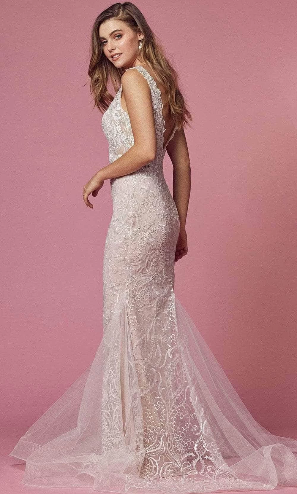 Brave the evening with temptress beauty and grace wearing this beautiful wedding dress by Nox Anabel JW909. Accented with scallops along the plunging V-neckline, this sleeveless ensemble showcases an embroidered lace fitted bodice with wide shoulder straps supporting the dress. A V-Shaped cut highlights the open back as the trails of embroidered details stream down as the trumpet skirt sculpts with godets and flares into a court train. Embrace a style that is immaculately beautiful as you glam up for your ever after in this Nox Anabel Masterpiece. Model is wearing the White and Rose Color
