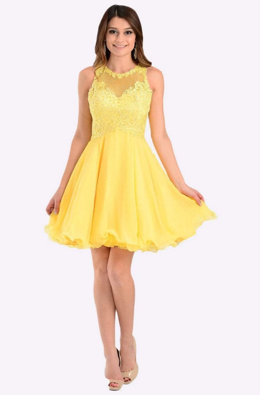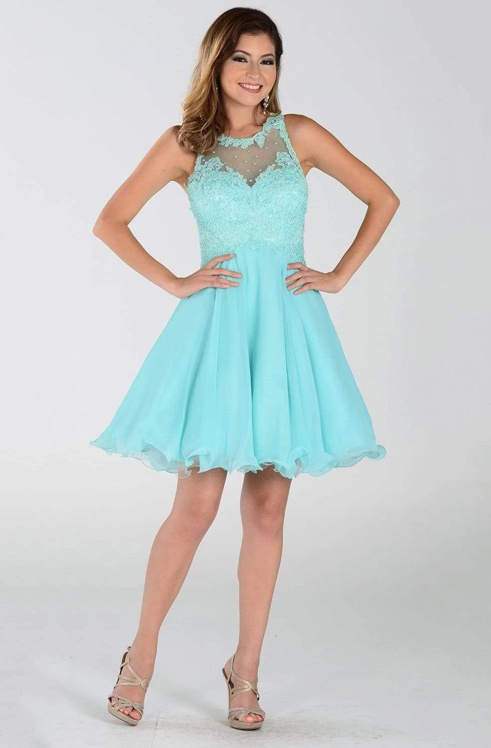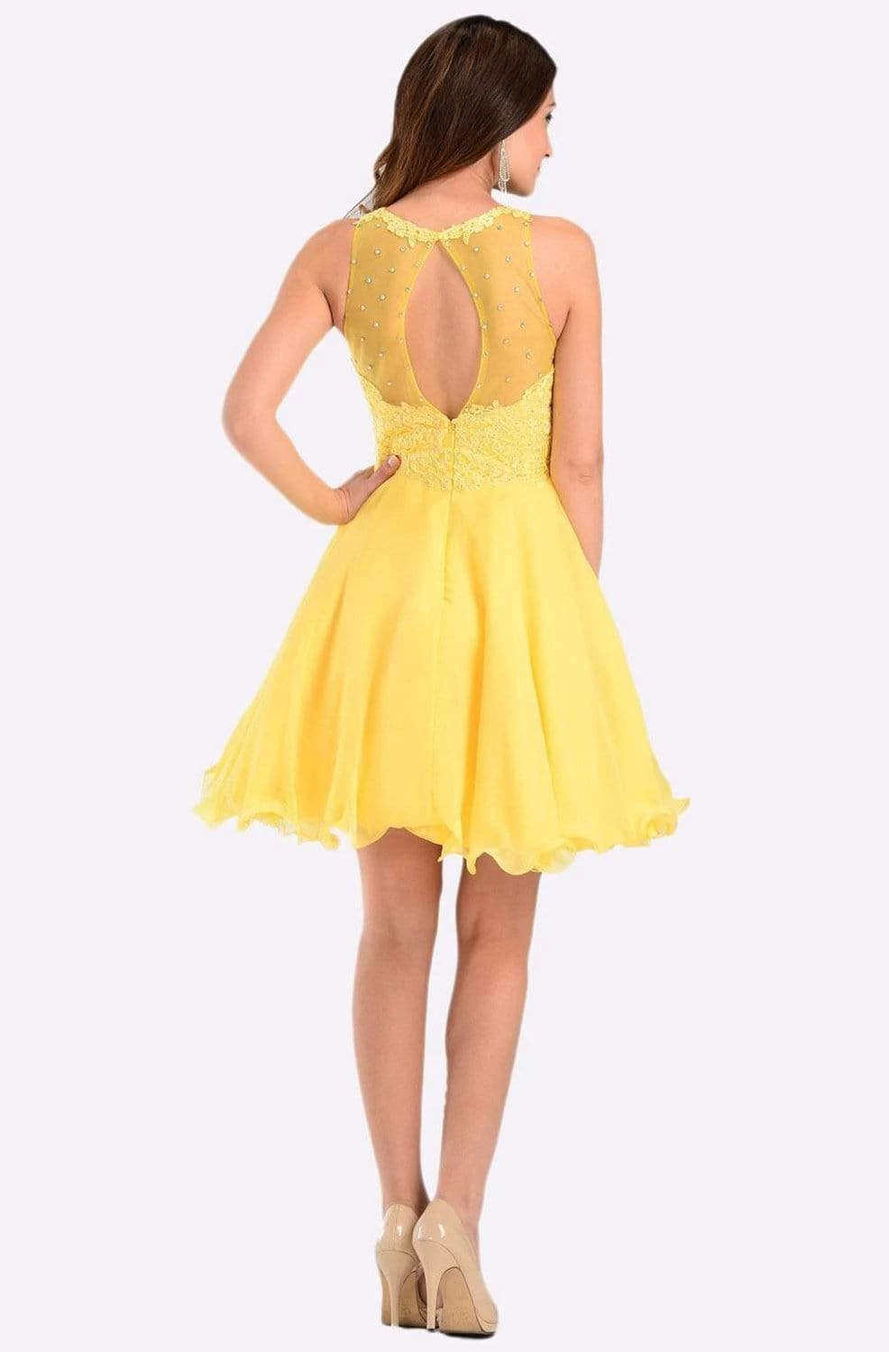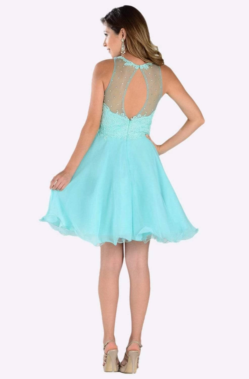 Be the loveliest of them all when you don this oh! so pretty Poly USA 7456 cocktail dress. Showcases a sleeveless, jewel neckline with sweetheart lined bodice designed with lace appliques embellished with sparkling rhinestone beads. The dress shows a long keyhole at the back and flourishes a mid-length A-line chiffon skirt with playful flared finish. Show off your playful but elegant side in this Poly USA creation.
