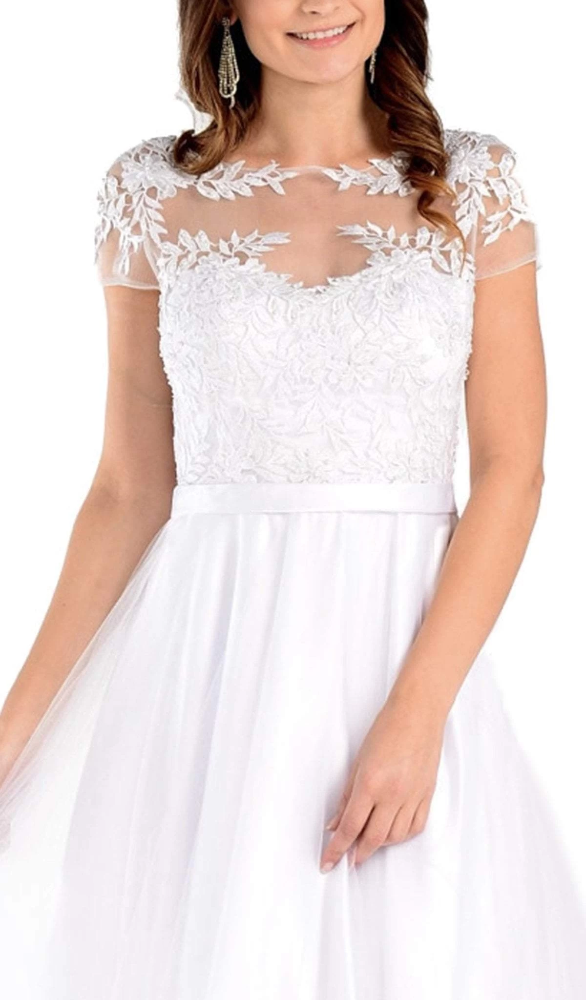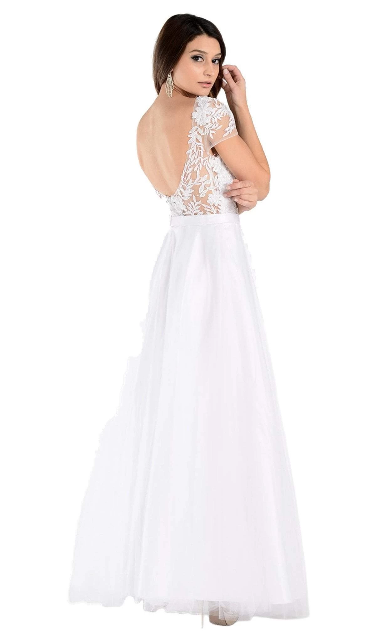 Channel red carpet glamour wearing this gown from Poly USA 7482. Features an illusion bateau neckline with a sweetheart lined bodice styled with short sleeves and embroidery. The back shows a low scoop cut and has a zipper closure. The waist is wrapped in a thin band and flourishes a tulle satin A-line skirt. Youโre sure to enchant the crowd as you enter the hall in this elegant gown by Poly USA.