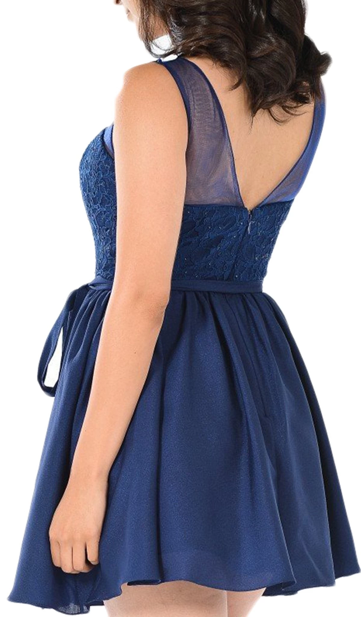 Walk in seduction and style in this dress by Poly USA 7500. Fashions a sleeveless, illusion scoop neckline with sweetheart lined bodice overlaid with lace fabric and embellishments. The bodice is cinched in a tie waist and shows off a V-back with a zipper closure. From the waist flourishes a mid-thigh A-line skirt. This Poly USA dress is a stunning look for your evening occasion.