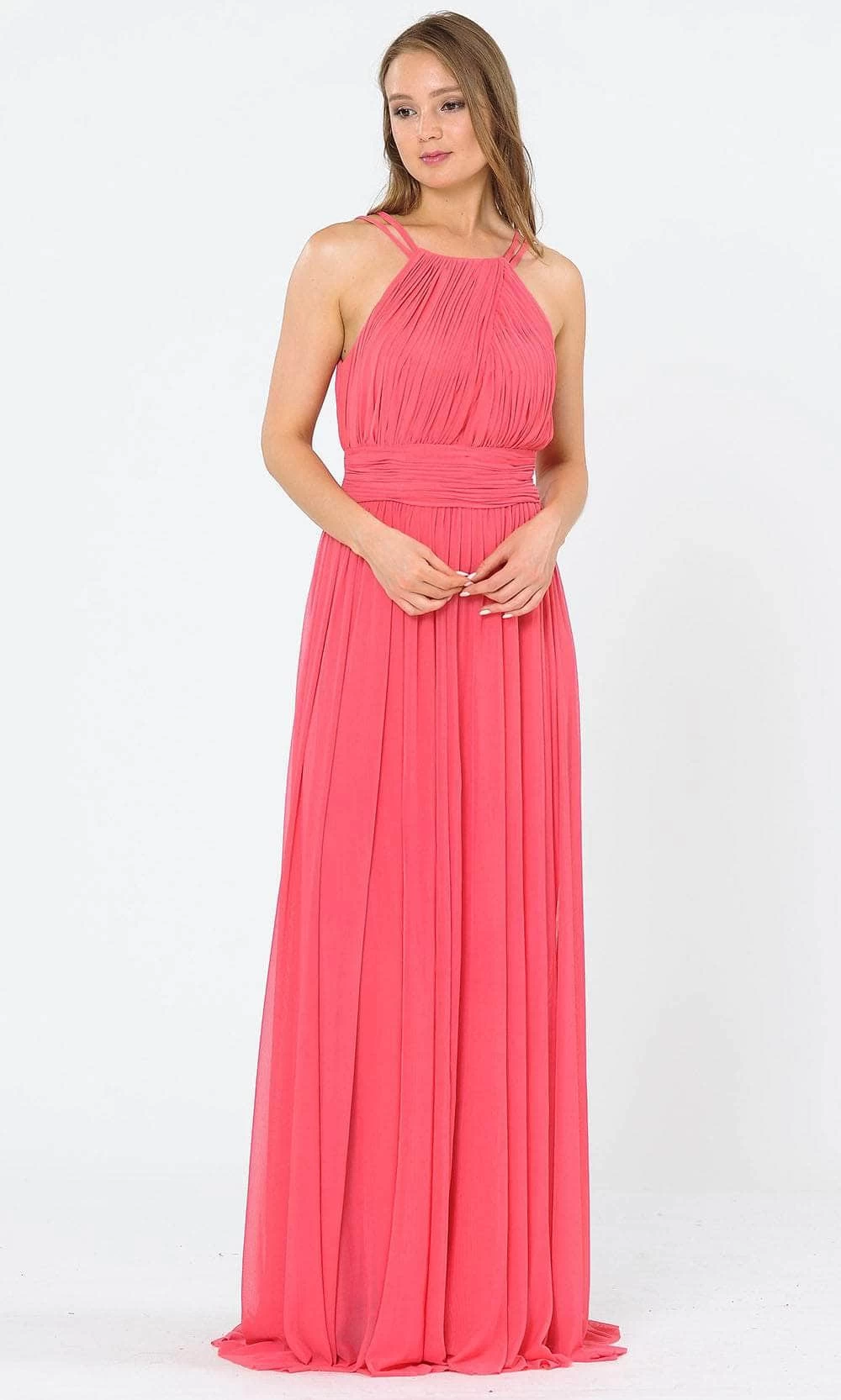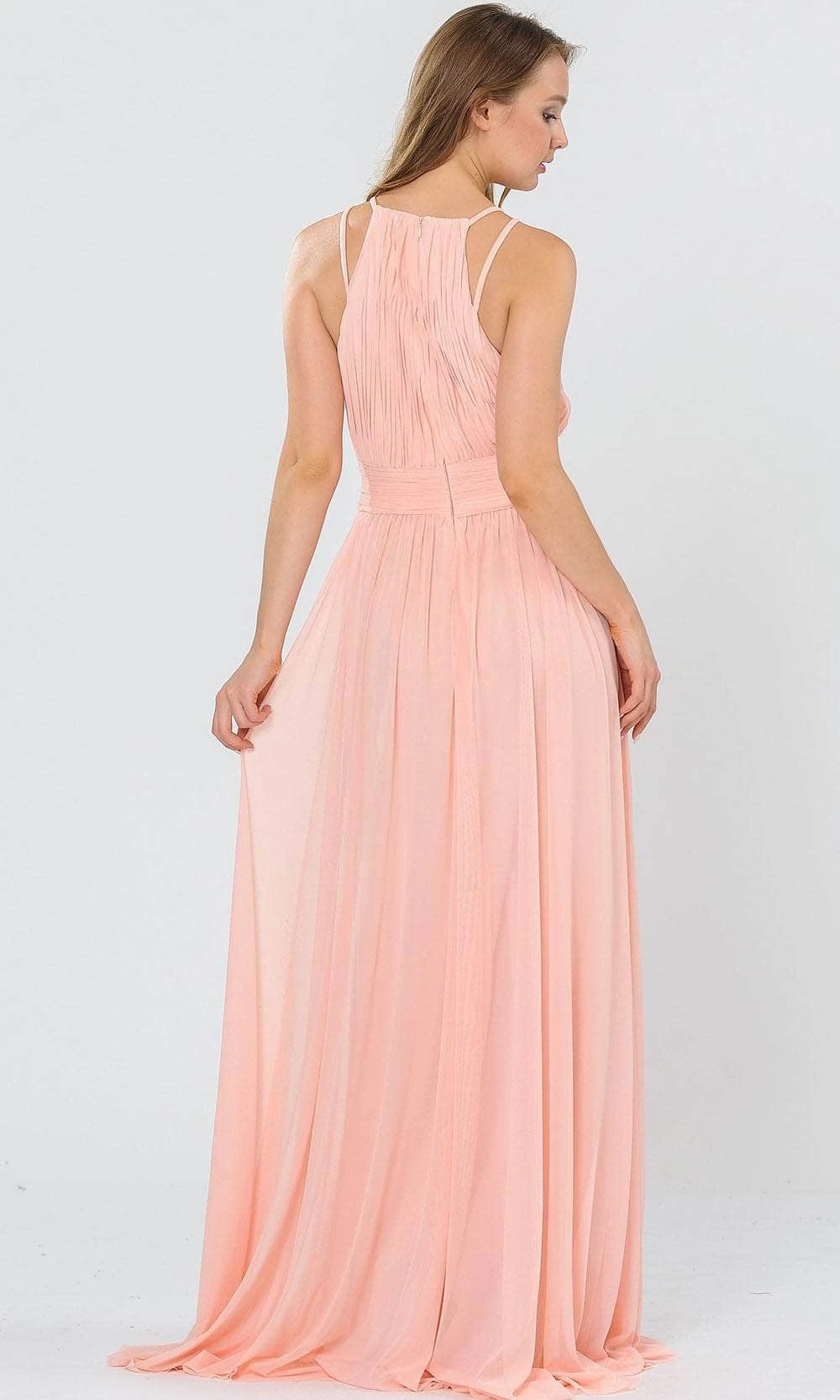 Go for a timeless and sophisticated look wearing this prominent gown by Poly USA 8396W. This gorgeous piece flatters with a high halter neckline held by dual thin straps. The dress parades with delicate pleats accented by a bandeau waistband and flows stunningly down to a full-length hemline with a sweeping train. Inspire admiring glances and fascinated stares when you walk in this Poly USA creation. Poly USA dresses are for every girl who wants to flaunt her unique style and has an eye for fashion. This assortment of special occasion dresses is breathtakingly beautiful that is sure to slay the crowd at any event. The models are wearing Blush, Coral, D. Red and Navy colors.