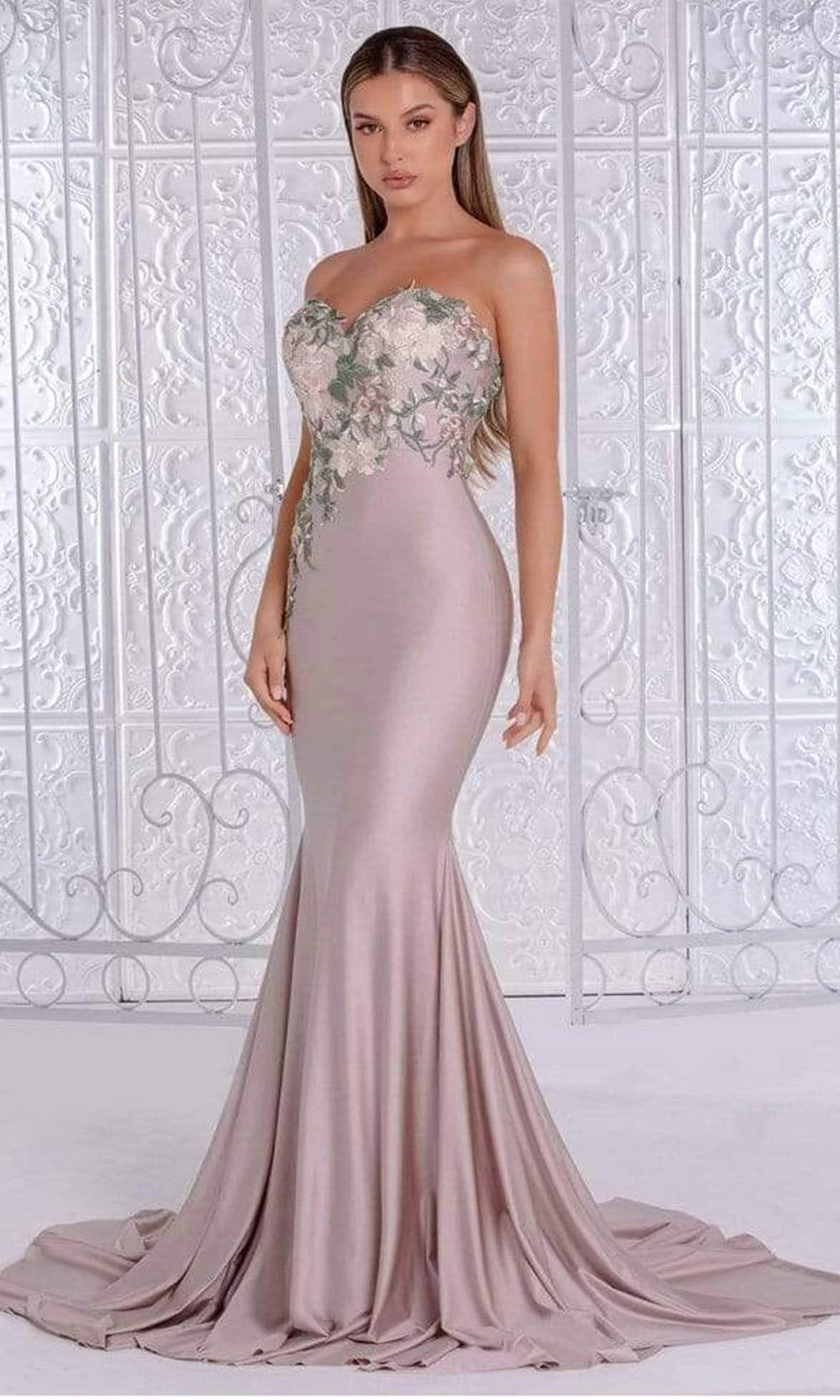 | Details: | Strapless, Floral, Embroidery, Fitted bodice, Shiny fabric, Mid back, Back zipper, Floor length, Court train |