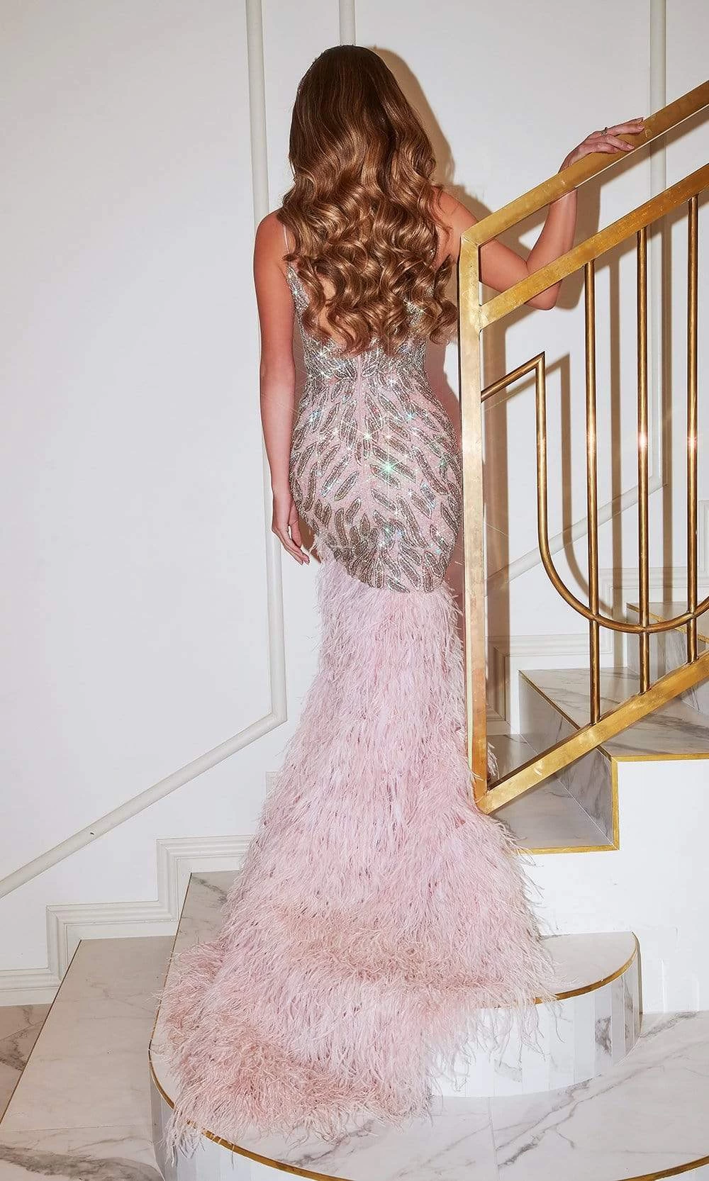 Sparkle in beauty wearing this Portia and Scarlett PS21504C creation. Stunning patterned beadworks and sequin ornate the form-fitting bodice of this lustrous gown featuring a sleeveless, deep V-neckline with sheer inset and shoulder straps paired with a sexy low-cut open back. The trumpet silhouette continues through the hips while the feathery finish beautifies the fringed skirt with a leg high slit and tapers to a full-length hem and sweep train. Be ready to mesmerize the night in this Portia and Scarlett masterpiece. Model is wearing Pink color.