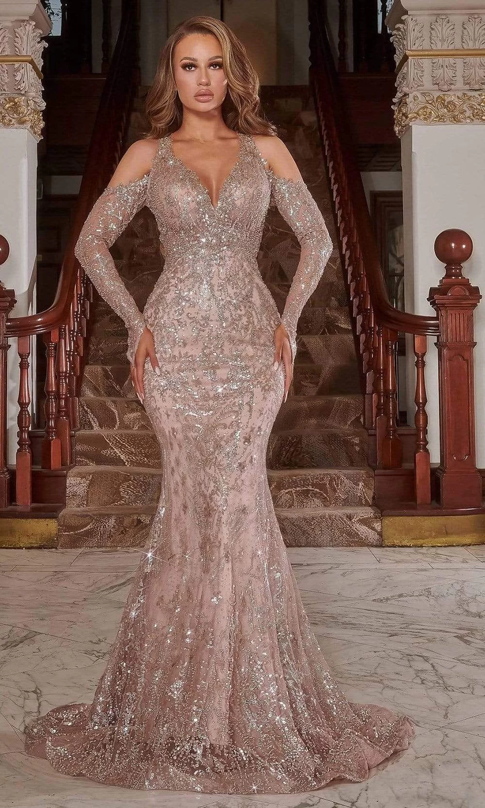 | Details: | Long sleeves, Cold shoulder, Fitted bodice, Bra cups, Embellished, Back zipper, Sculpted, Floor length, Sweep train |