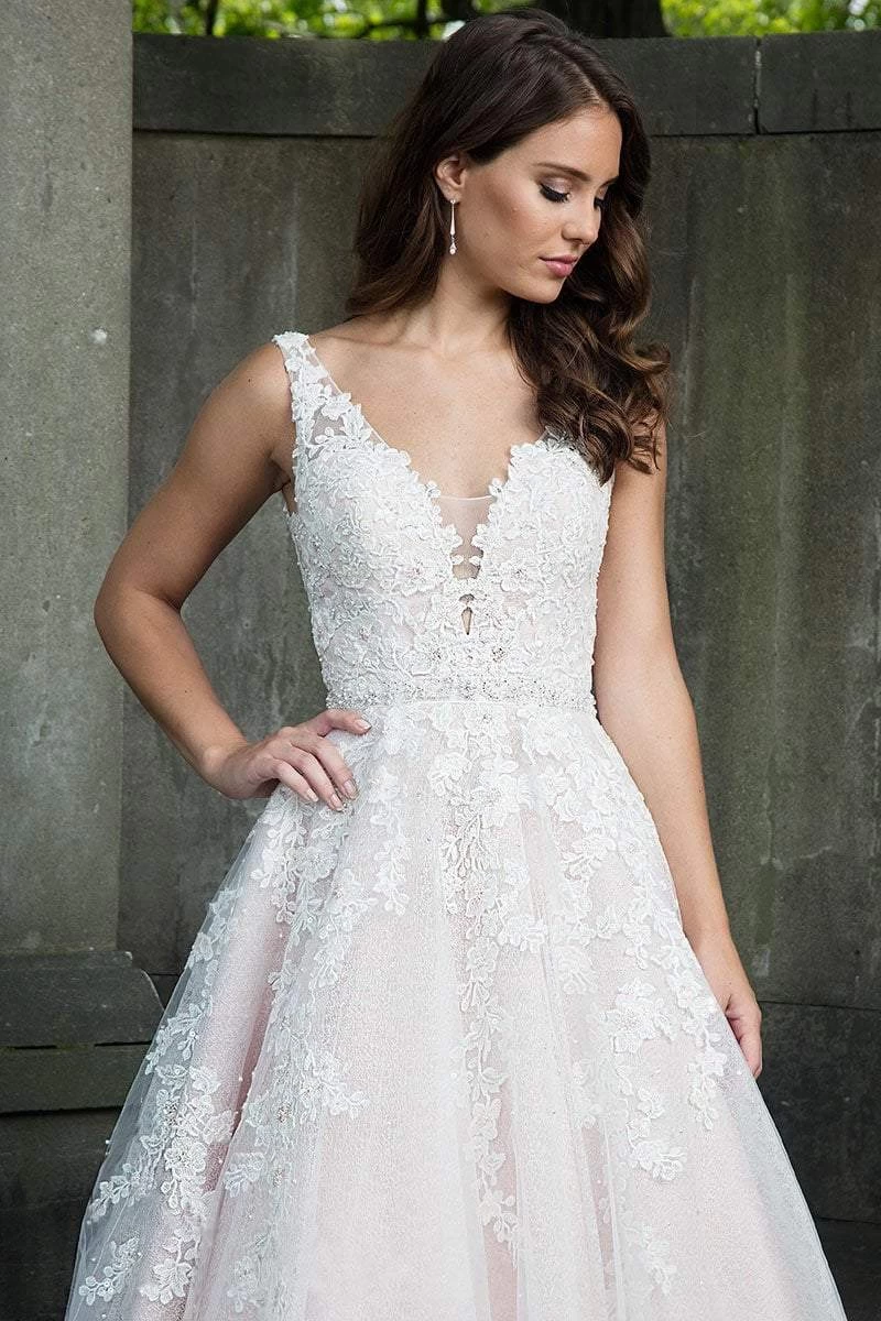 Make his gaze linger on you as you walk down the aisle in this mesmerizing Rachel Allan M636 creation. Stunningly adorned with intricate embroidery detailed with floral appliques, this lovely charmer shows a plunging v-neckline with an illusion inset. This sleeveless ensemble showcases a v-illusion open back rhyming with a romantic trail of fabric-coated buttons. Cascading with dreamy tendrils of botanical appliques, the ballgown is beautifully layered with gossamer fabric as it dramatically flares down to a pool of ethereal train. Breeze through your special day while making a stylish statement in this Rachel Allan masterpiece. Model is wearing the Ivory/Blush color.