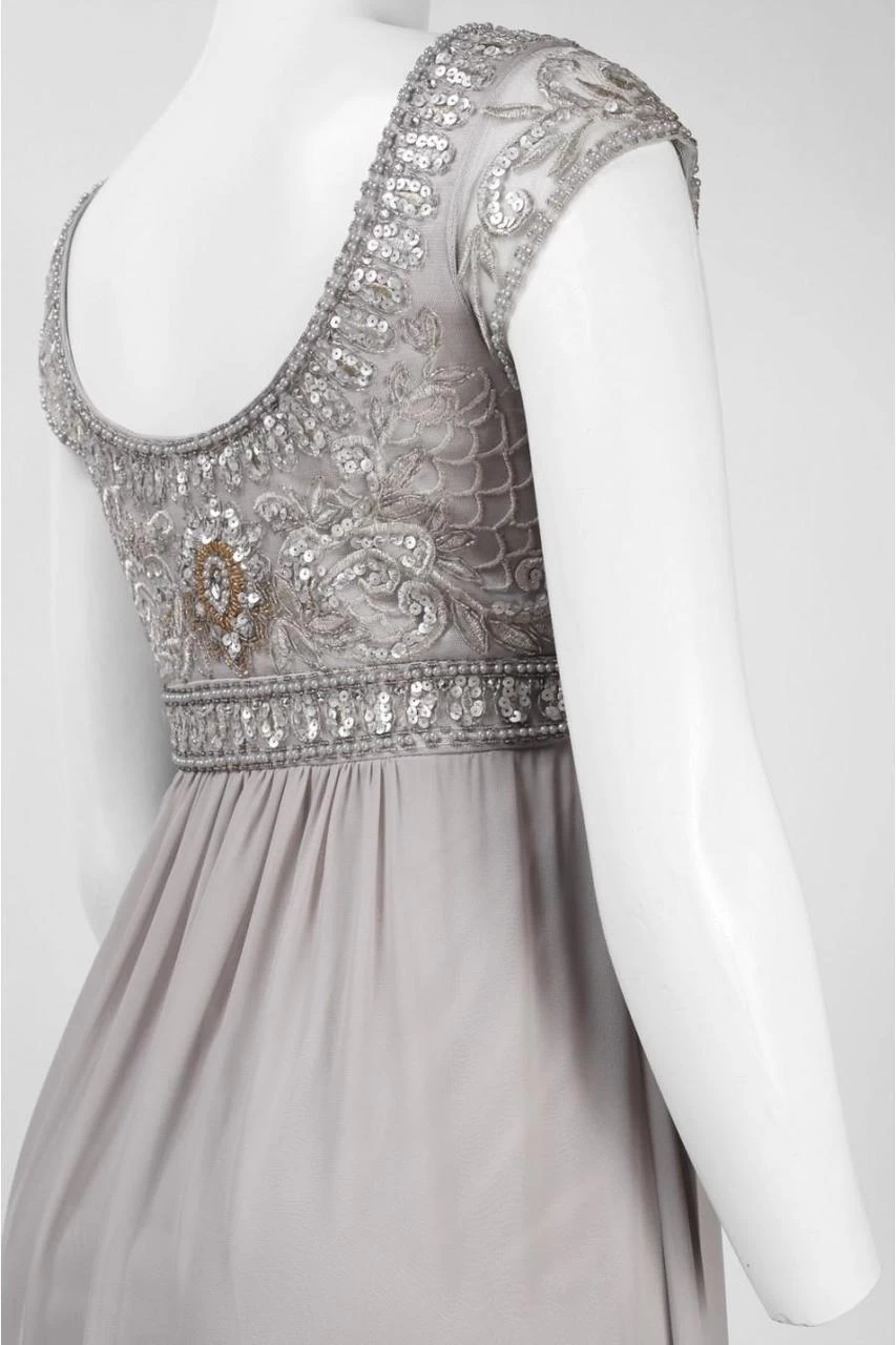 Get ready for everyone to stop and stare when you show up in this dress by Sue Wong N4438. Features cap sleeves with scoop neckline. The bodice is richly decorated in sequins and embroidery. From the empire waistline flows a full length Chiffon A-line skirt. Be in this gorgeous Sue Wong creation and leave a lasting impression.