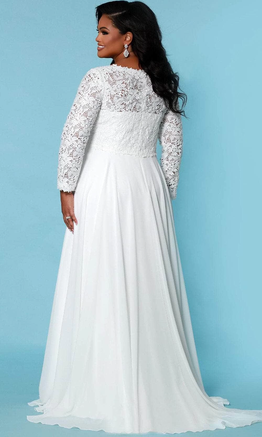 Flourish a stunning magnificence befitting a goddess in this Sydney’s Closet Bridal SC5276 creation. Fashioned with feminine lace on the bodice and long sleeves, this gown parades a deep v-neckline with a full back. Accented with aย peaked empire design, the chiffon skirt gracefully floats down the aisle with itsย sumptuous train.ย Fall in love with the romance of this Sydney’s Closet Bridal masterpiece. The collection of bridal outfits from Sydneyโs Closet is appreciated for its elegance and sophisticated charm specifically tailored to ensure perfect and comforatable fit to aย real curvy body. Model is wearing the Ivory color.
