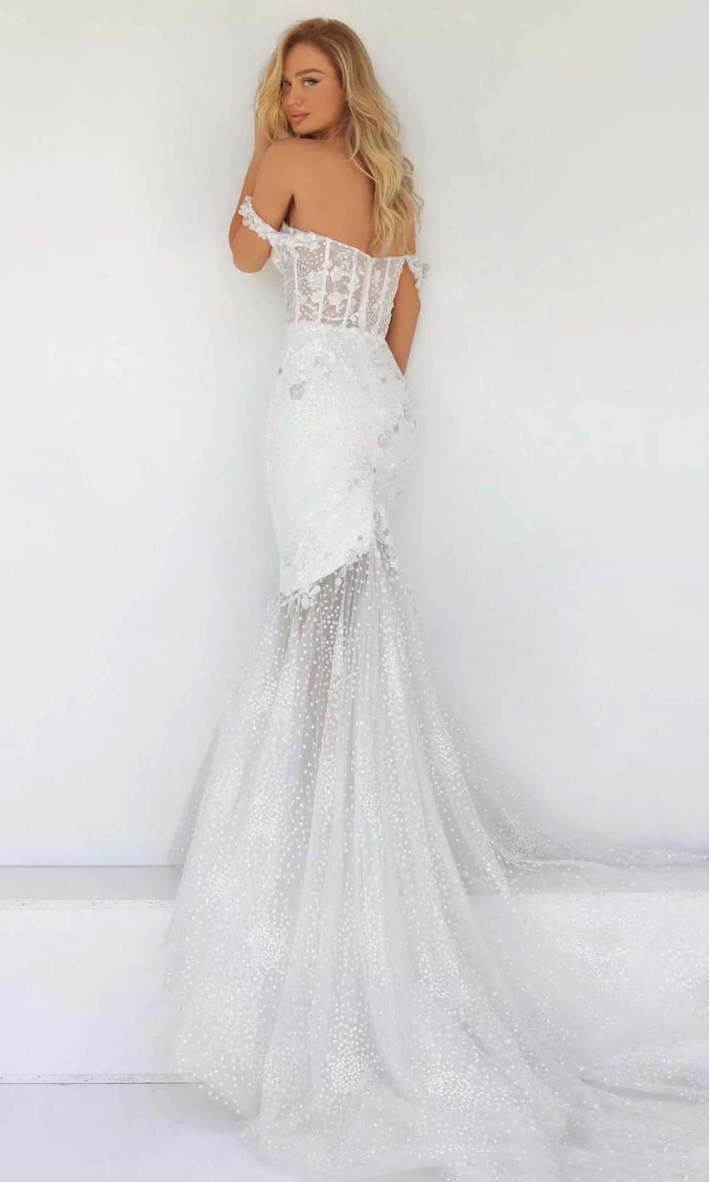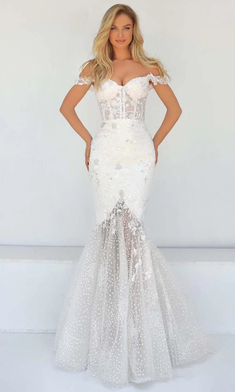 Look nothing short of immaculate in this Tarik Ediz 51034 creation. Donning lace embroidered appliques and beadwork, this stunner flaunts an off shoulder neckline on a sheer corset bodice. Shimmering with embellishments, the mermaid skirt slims along the waist before flaring into a trail of train. Be enchanted by the romantic appeal of this Tarik Ediz masterpiece. Model is wearing the Ivory color.