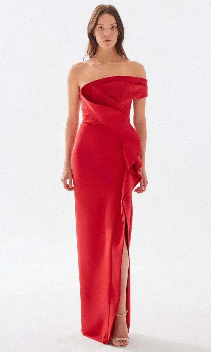 Exceptionally tailored to reveal a luxurious feel with its voluminous ruffled design, this piece flaunts an asymmetrical bodice with an off shoulder short sleeve. Styled with a drape paneled back, the cascading ruffle accent trims the sexy slit. The sheath skirt sculpts and streams into a floor grazing hemline. Model is wearing the Red color.