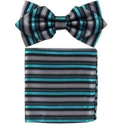 Add a colorful touch to your outfit with this turquoise and black striped bow tie and matching pocket square. Made out of polyester, this pointed tip woven bow tie features a nice turquoise, black, and gray striped pattern. This bow tie and pocket square set comes packaged in a nice box, so it makes a great gift for men!
