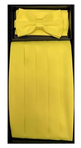 Add a special touch to your tuxedo or uniform with this 3-piece yellow cummerbund, pre-tied bow tie, and handkerchief set. This yellow cummerbund will accentuate your tuxedo and is great for any formal event.